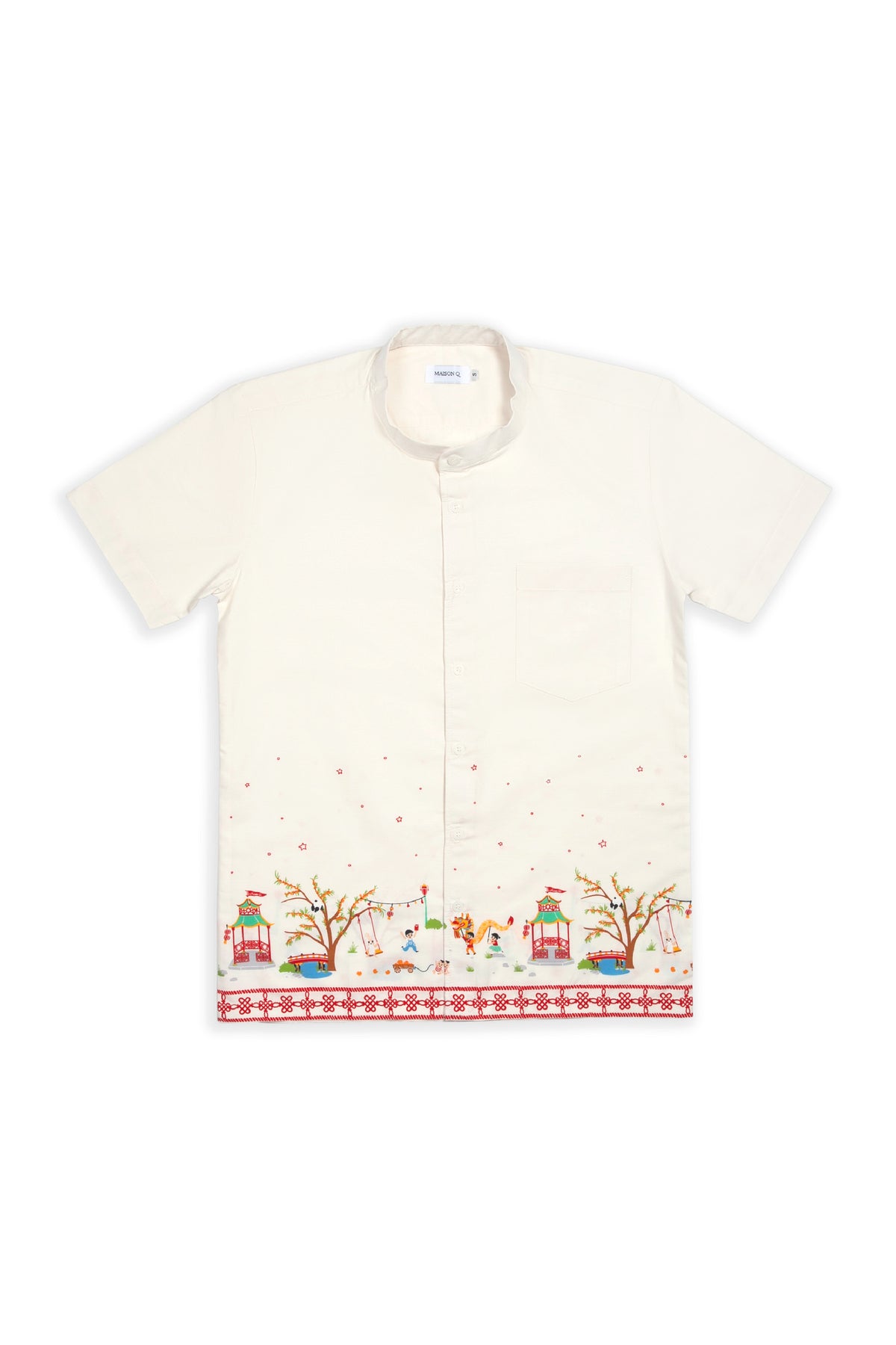On one end stands a tall orange tree flanked by a pond. A bridge stretches over to a pagoda where joyful kids are having a go at performing the dragon dance. Miss Rabbit is perched on a swing while a mysterious little panda is mischievously sitting among the leaves.