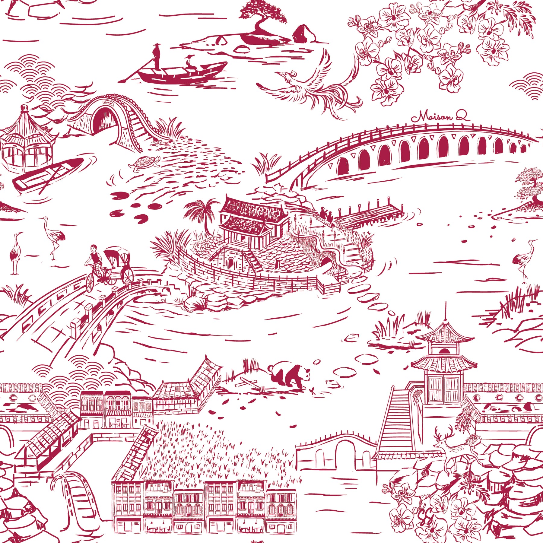Our A Straits Tale Toile print is a whimsical ode to the Straits, imagined through a tapestry of heritage and symbolism. Designed in a classic toile style, it depicts scenes of life along the waterways: bridges arching gracefully over rivers, sampans gliding across calm waters, and rows of shophouses and pagodas that root the story in place.