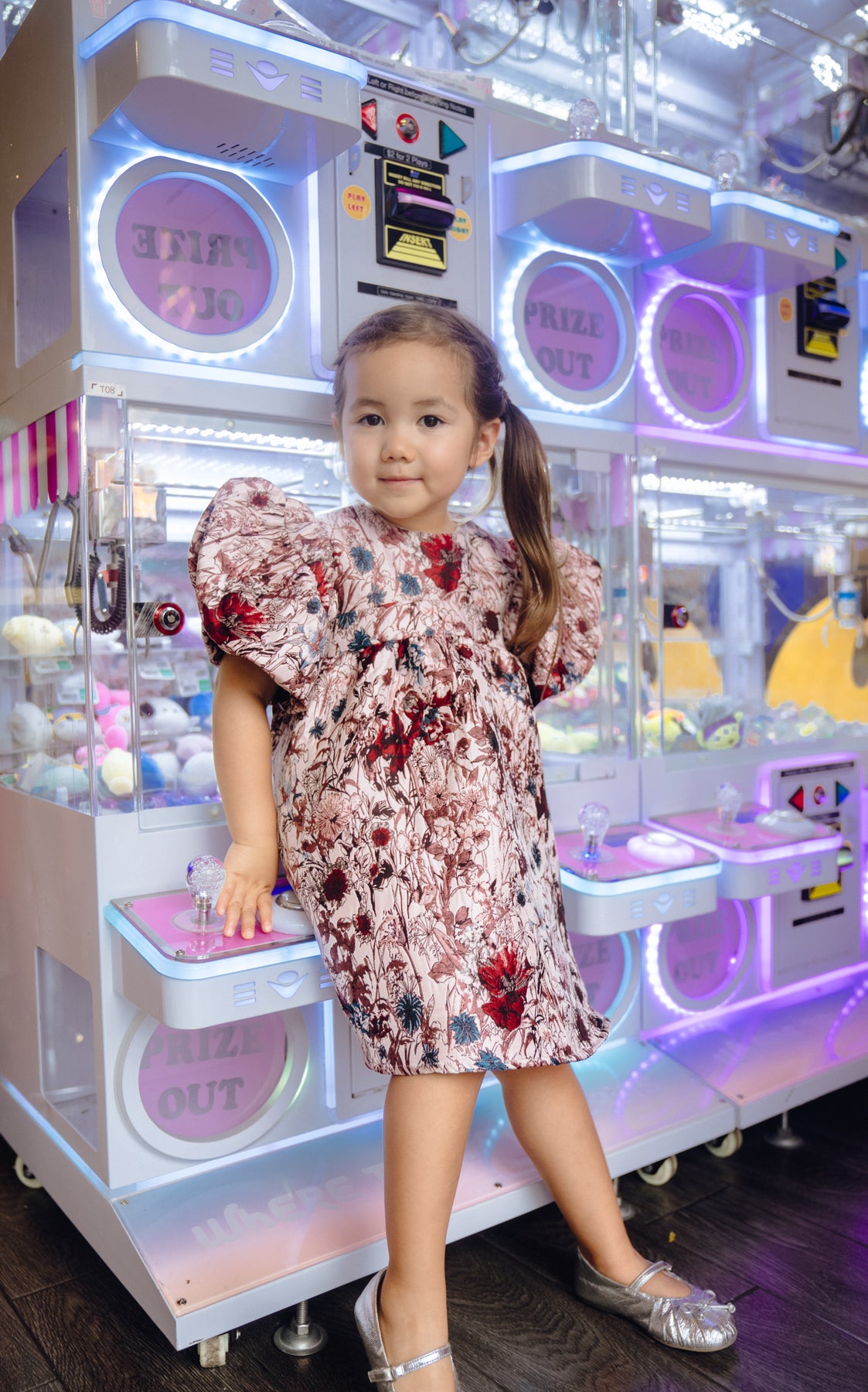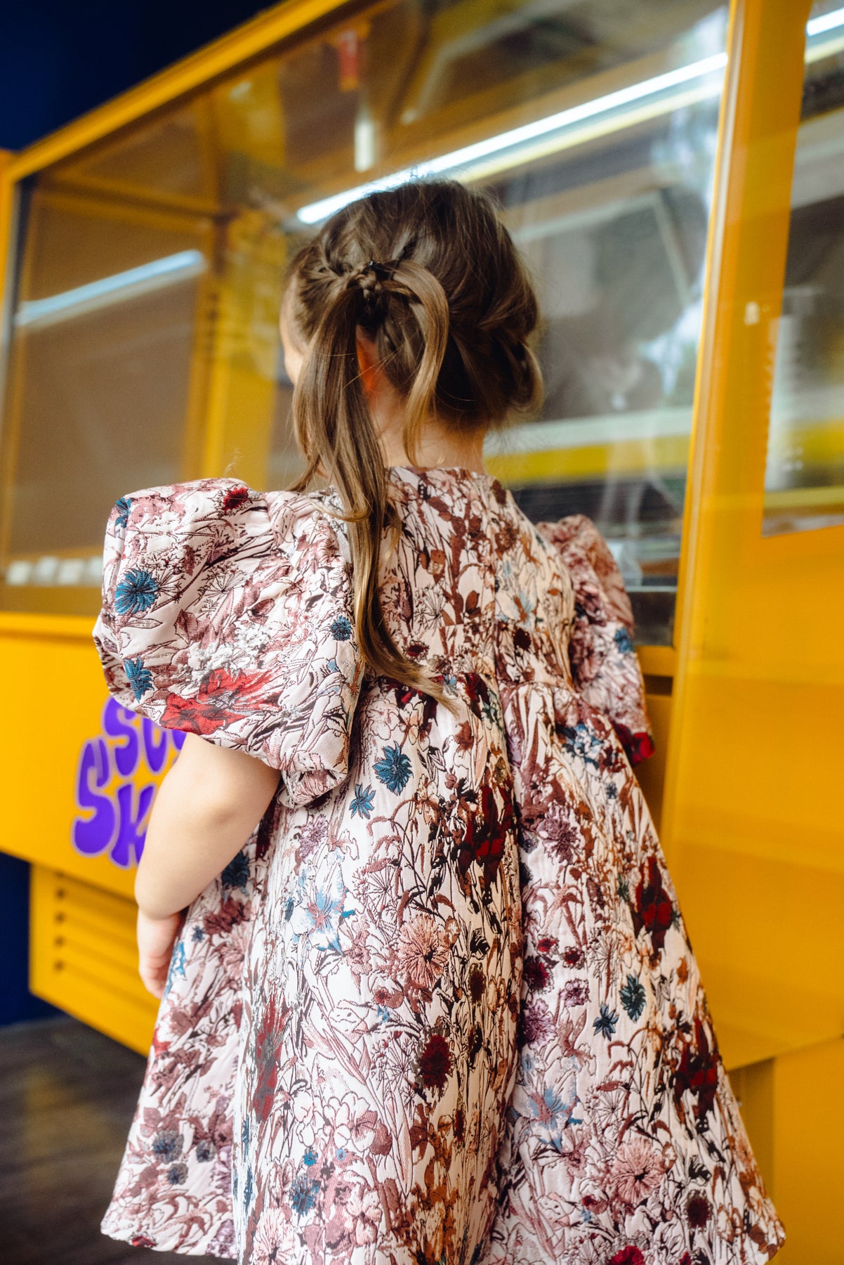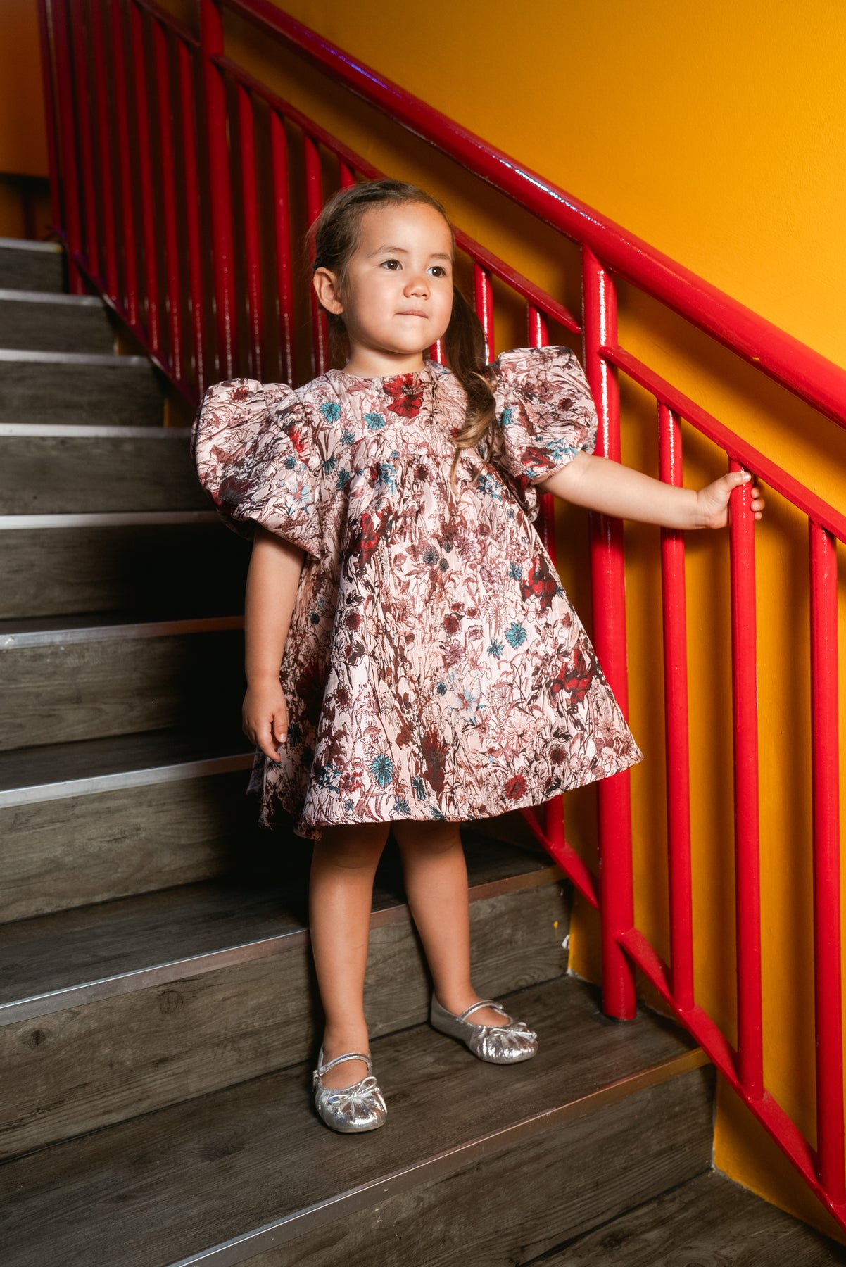 Pink Flora Balloon Sleeves Jacquard Dress - Maison Q
