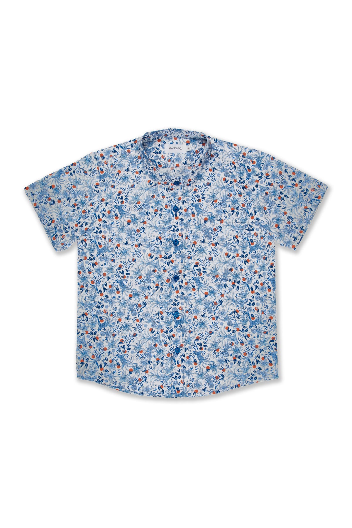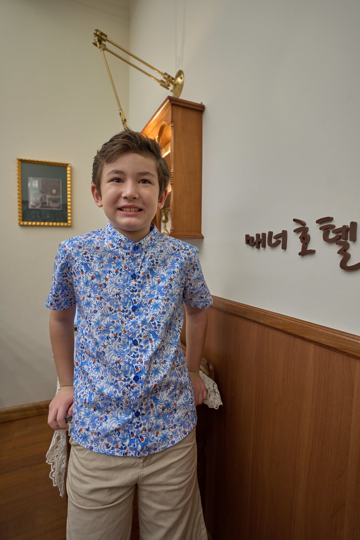 - A short-sleeved smart shirt for boys aged 8Y to 16Y with complementary coloured sew-on buttons down the front.