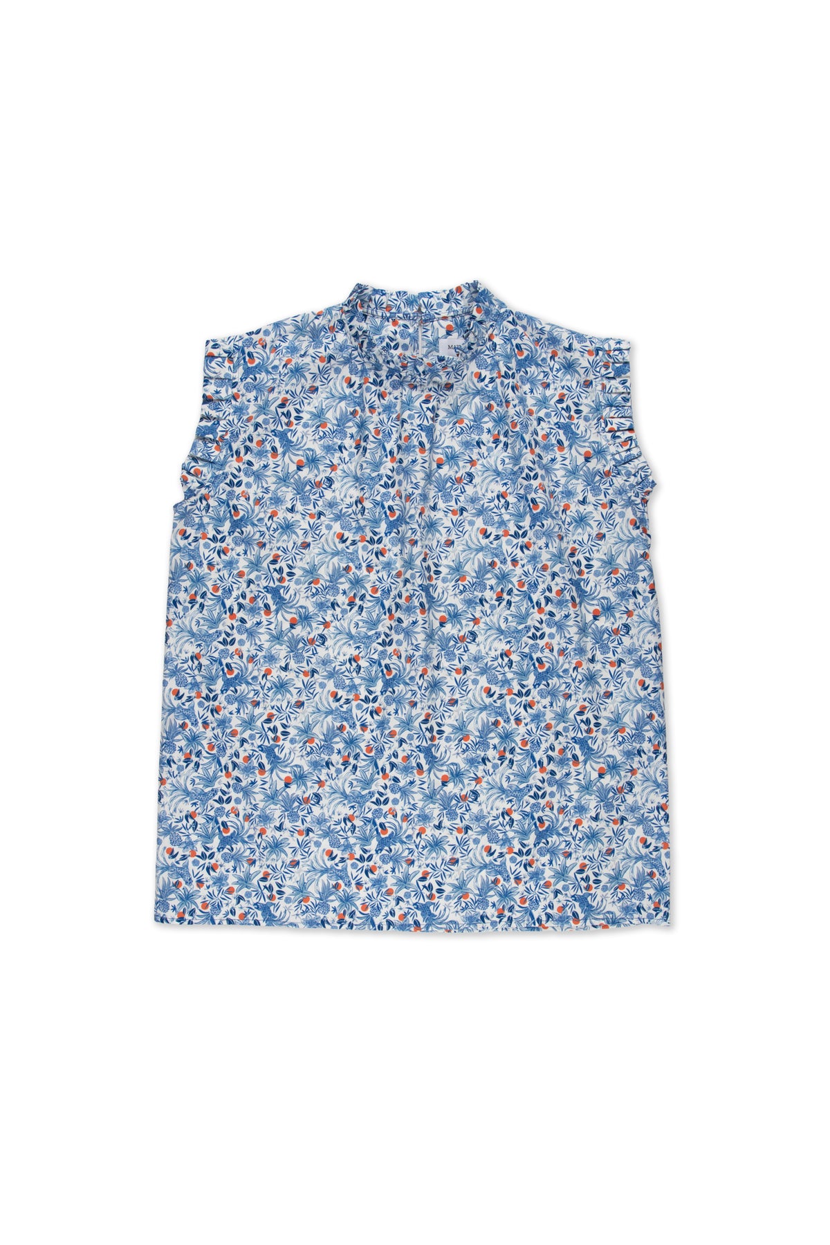 A loose fit sleeveless blouse with beautiful pleated detailing around the arms and collar, which adds visual interest to a simple silhouette.