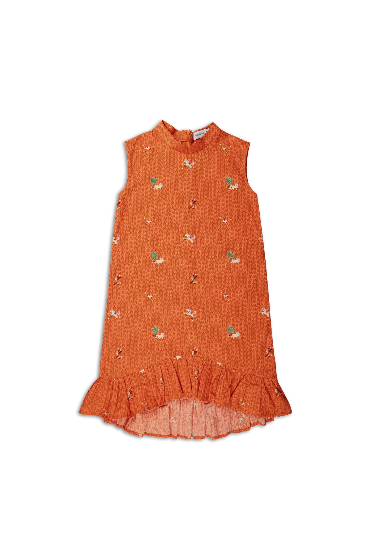 • modern cheongsam with a high-low ruffled hem and a Mandarin collar. This back hem is longer than the front hem. It features an A-line cut and can comfortably fit most kids in the age range