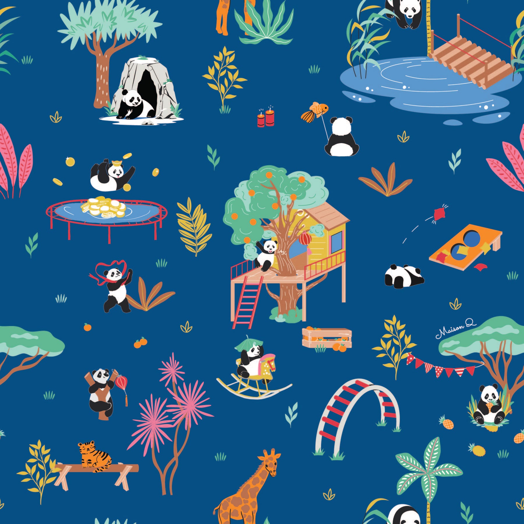 Our favourite cuddly creature returns this festive season in Panda Playground. This lively print is inspired by the different ways pandas behave around the world — from their quirky antics to their gentle charm — reimagined through the Maison Q lens.
