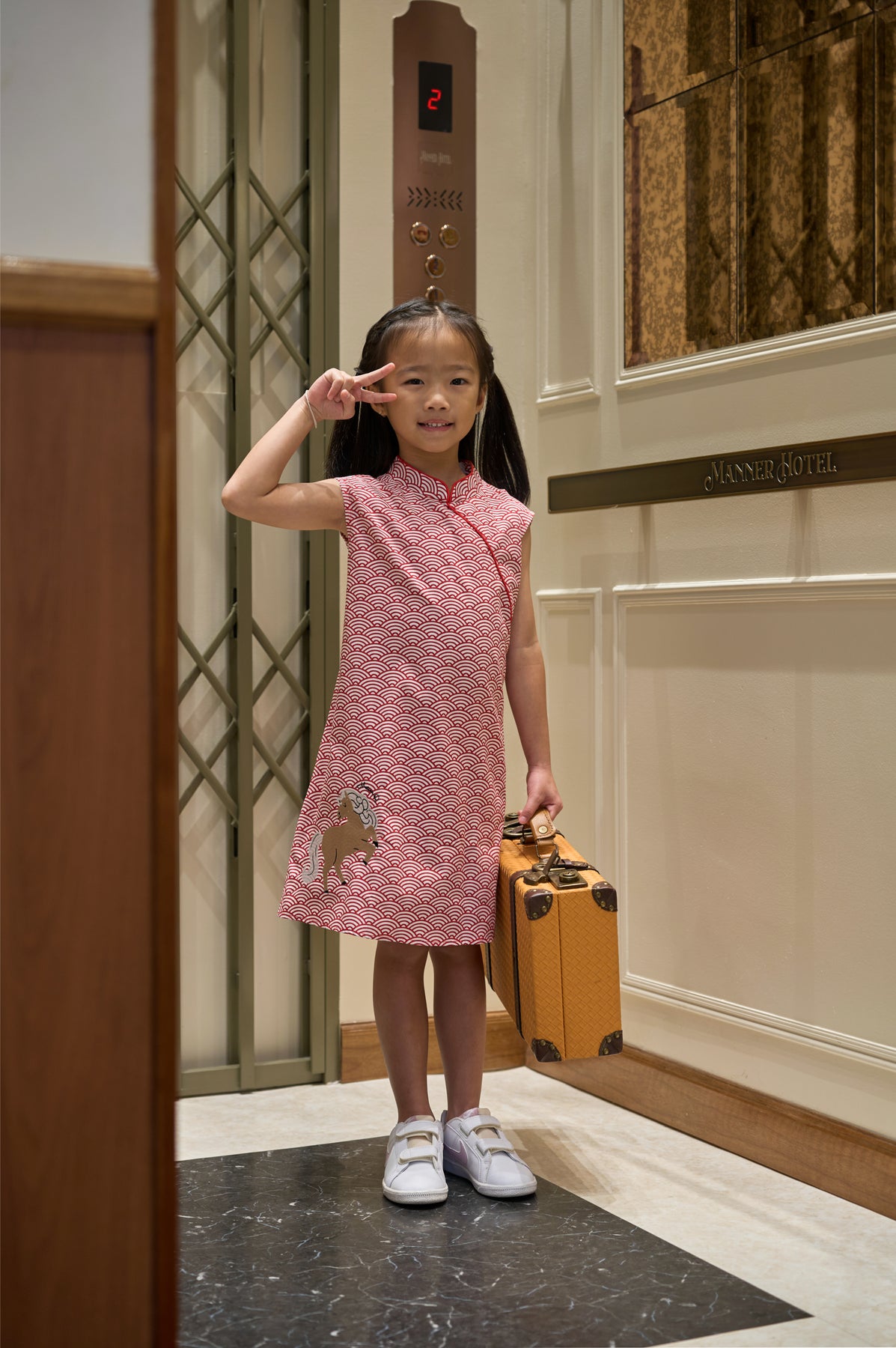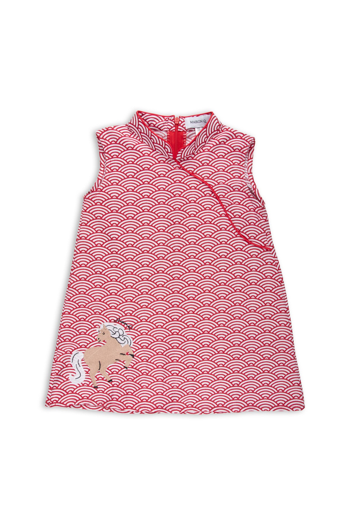Features a charming horse that has been intricately embroidered on the bottom right of the cheongsam adding a punch of fun to the outfit.